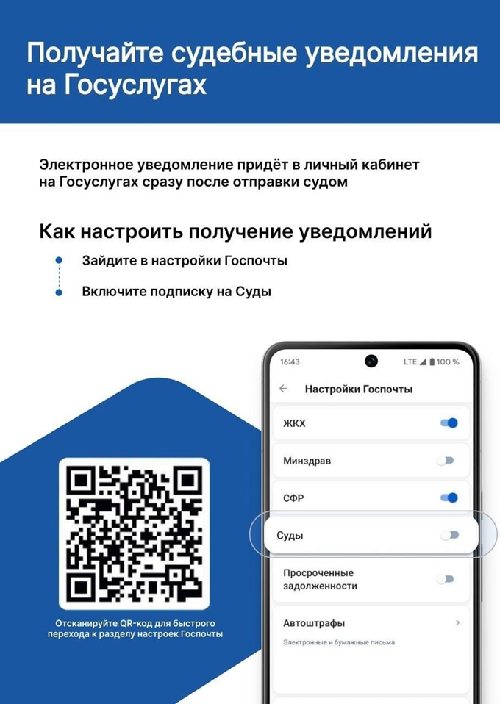 Доставка судебных уведомлений осуществляется в личный кабинет физического лица, индивидуального предпринимателя, юридического лица на портале «Госуслуг» исключительно при наличии согласия адресата на получение судебных уведомлений. Чтобы получать уведомления из суда, необходимо дать согласие в соответствующем разделе портала «Госуслуги» в настройках личного кабинета, для этого: • Войдите в личный кабинет приложения «Госуслуги». • В разделе «Профиль» откройте вкладку «Настройка Госпочты». • Выберите параметр «Суды» и включите получение электронных писем. Либо отсканируйте QR-код с помощью камеры смартфона, затем перейдите к разделу «Настройка Госпочты» на «Госуслугах», далее выберите параметр «Суды». Преимущества получения документов с помощью ГЭПС: моментальная доставка в личный кабинет и на электронную почту; судебная корреспонденция не теряется, она всегда доступна в электронной форме; нет необходимости получать корреспонденцию в бумажном виде в отделении Почты России; лицу, участвующему в деле, будет доставлено письмо в электронном виде даже при смене места жительства и отсутствии возможности проконтролировать почтовую корреспонденцию на бумажном носителе; конфиденциальность. |
